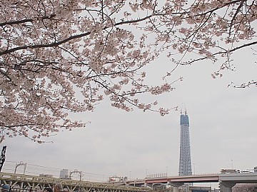 広々とした隅田川(上)と、日本一の高さになったスカイツリー(建設中)