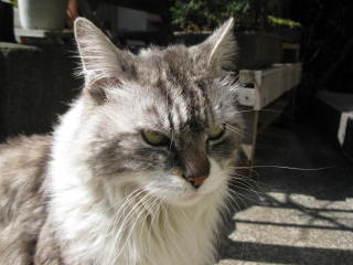 福太郎。 家の庭で。 なんか逞しい後姿だな・・・ しかし、今日も近所の古参猫にビビっていたらしい。 古参猫・マーボー。 飼い主の話では、20歳近いという。 福太郎が仔猫の時から睨みを利かしている。 伊達に年取ってないようだ。