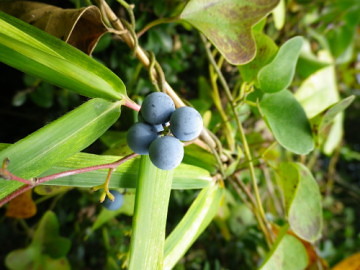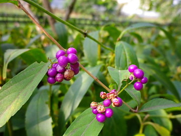 散歩先で・・・ 何の実? 葉の形がサルトリイバラに似ていたが、違う。 ムラサキシキブ。 ちょっと傷んでるけど、きれいなむらさき色。 秋はそれなりに彩があるな・・・